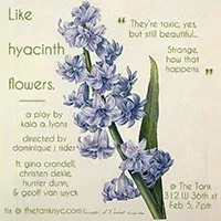 Moving between a Pennsylvania flower shop, an abandoned community garden, the sky, and all the space between, Like Hyacinth Flowers finds four divine beings struggling to maintain harmony with their powers. While Iphigenia works to control the everlasting spring and Hestia tries to reconcile her fourteen-year-old consciousness with her thousand-year-old one, Persephone finds herself falling for a man, Hades, who soon reveals himself to be abusive. As his violence causes her to lose her plant-growing abilities, she must find her power in order to regain them.
